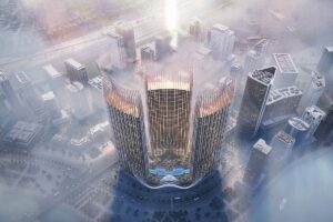 Architecture: Three 48-storey towers featuring dynamic design with reflective glass facades, vertical lines, and illuminated crowns.
